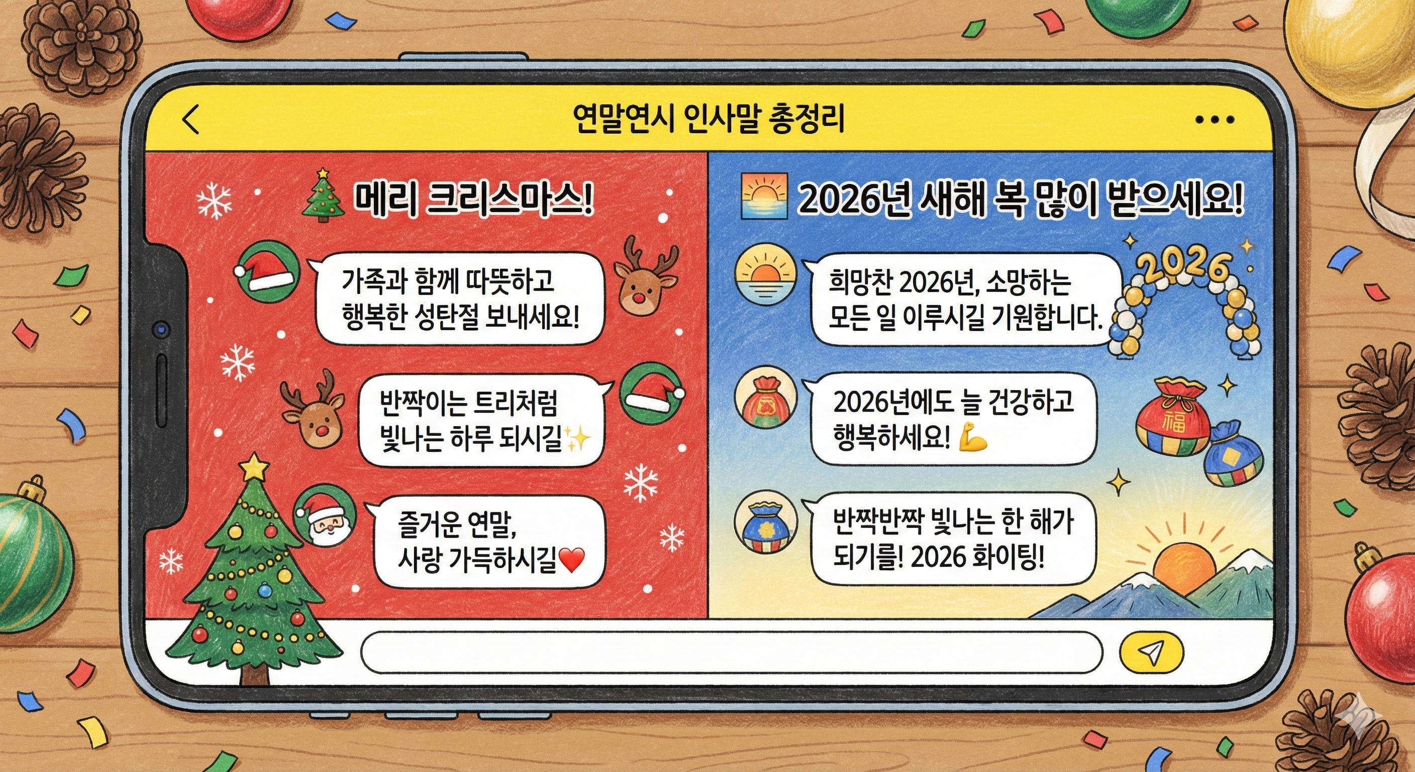 - 이모지 듬뿍: 🎄🎅❤️🐴🔥🎉 적절히 섞어 생동감 주기.