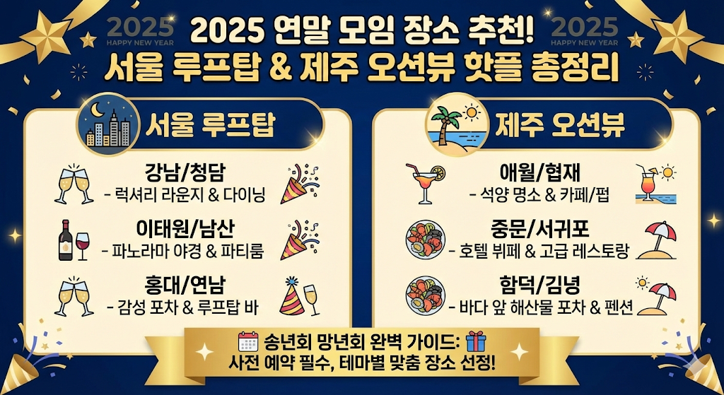 2025 연말 모임 장소 추천으로 서울 루프탑부터 제주 오션뷰까지 다양하게 준비했어요. 소중한 사람들과 따뜻한 추억 쌓으시길! 여러분의 추천 장소나 경험 댓글로 공유해주세요 – 다음 포스팅 참고할게요. 행복한 연말 되세요! 😊