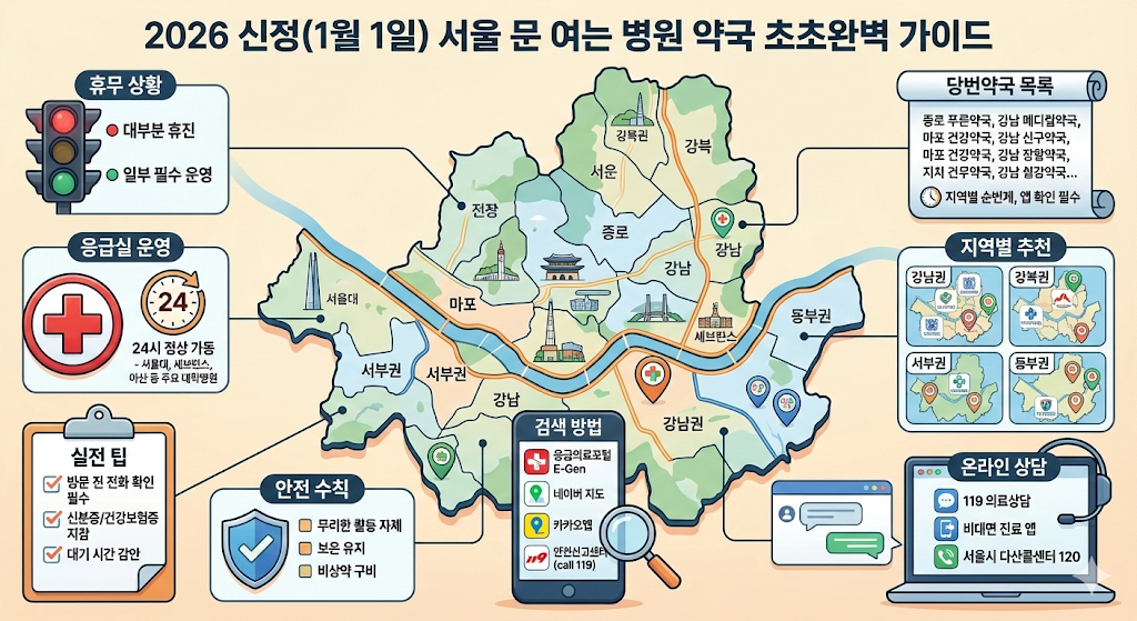 2026 신정 문 여는 약국 서울 추천: 당번약국 & 휴일지킴이약국 지역별 상세 목록 & 영업시간