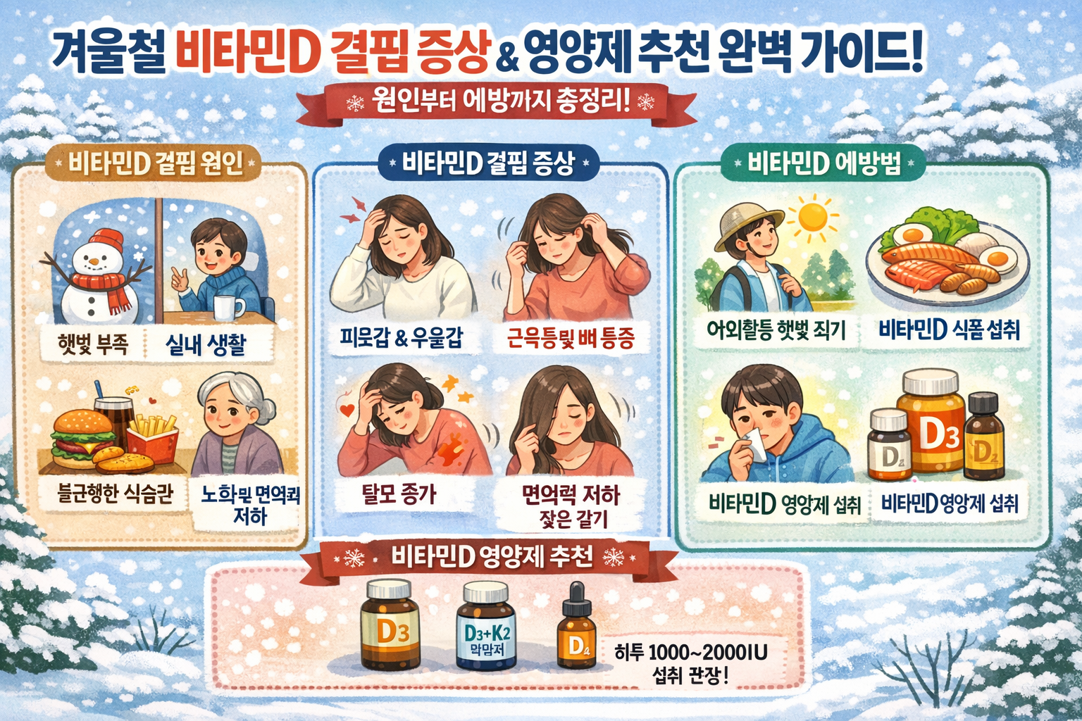 안녕하세요, 여러분! 건강과 웰빙을 위한 실질적인 팁을 공유하는 블로그 '레아'입니다. 추운 2026년 겨울이 본격적으로 시작되면서, 많은 분들이 피로감과 무기력을 느끼고 계실 텐데요. 이는 겨울철 비타민D 결핍 때문일 가능성이 큽니다. 비타민D는 햇빛으로 합성되는 영양소로, 일조량이 적은 겨울에 결핍이 흔히 발생하죠. 오늘 포스팅에서는 2026년 최신 정보를 바탕으로 겨울철 비타민D 결핍 증상, 원인, 영양제 추천, 섭취 팁까지 상세히 정리해 보았어요. 이 가이드로 여러분의 겨울 건강을 지키시길 바랍니다. 그럼 함께 알아볼까요?
