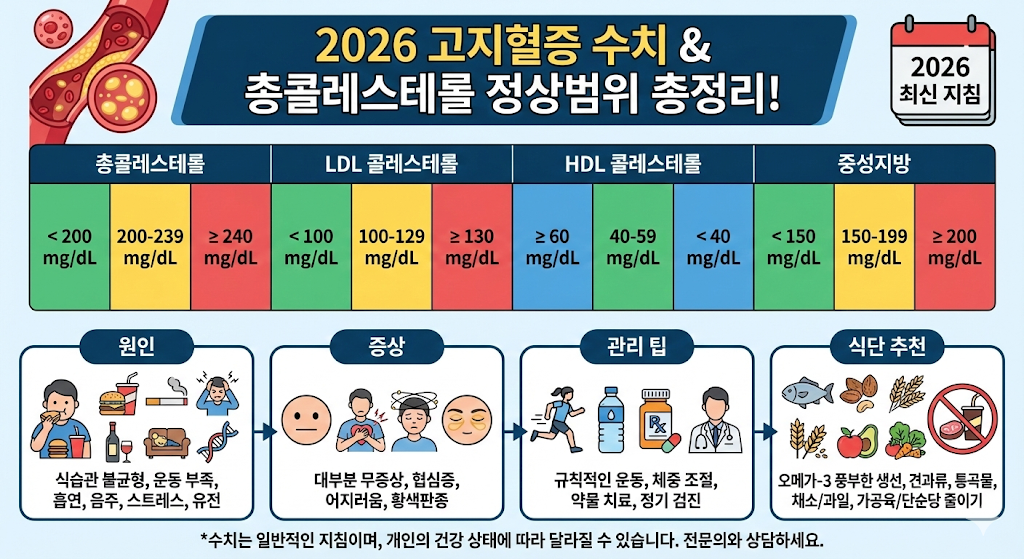 고지혈증 수치는 총콜레스테롤 <200 mg/dL, LDL <100 mg/dL이 바람직해요. 2026년에도 최신 지침 따라 관리하세요! 도움이 되셨다면 좋아요·댓글·공유 부탁드려요. 건강 챙기세요~ 😊